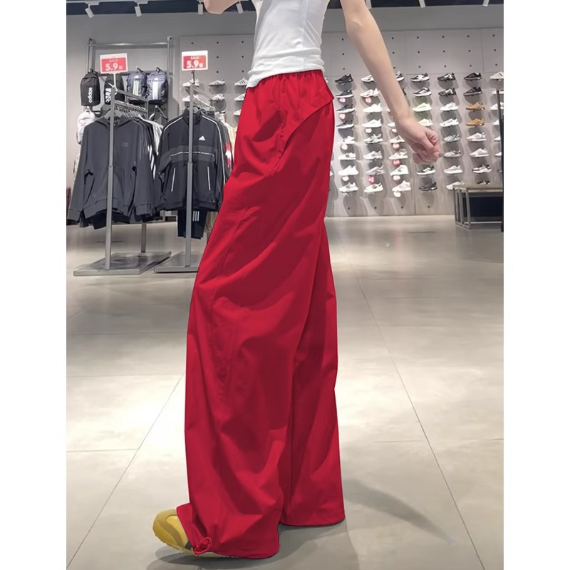 レッドカジュアル速乾オーバーオール女性の夏の新しいハイウエストスリムルーズワイドレッグアメリカンスポーツパンツ小柄な人向け