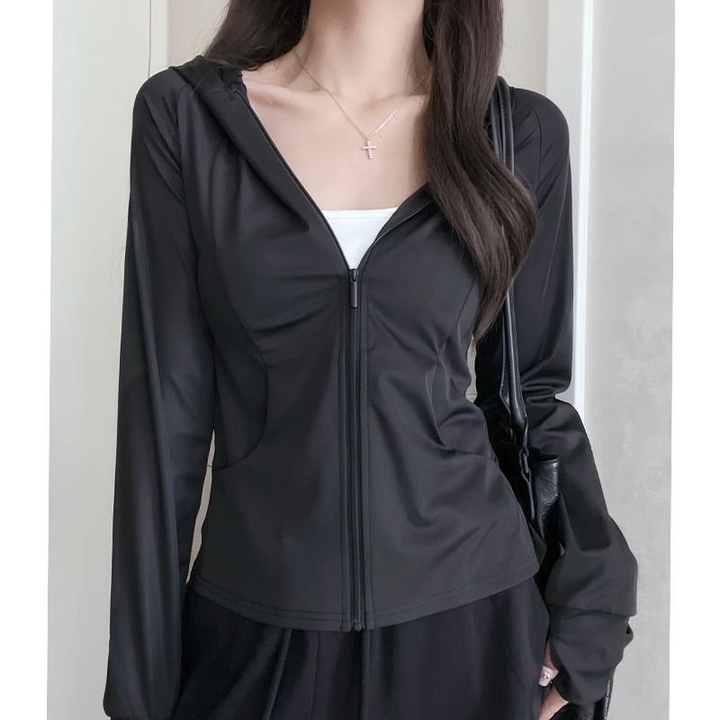 黒の帽子付き日焼け止め服女性の夏のスリムで薄い通気性のある氷糸日焼け止め服アウトドアスポーツのカーディガンのコートが薄いです。