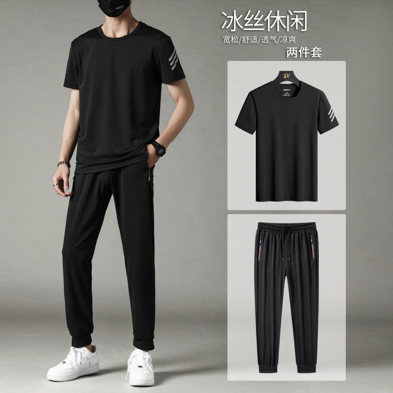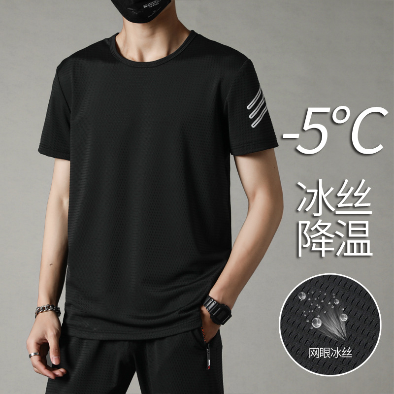 夏の男性スポーツスーツカジュアル半袖新型氷糸丸首tシャツ半袖半ズボンランニングゆるいフィットネス