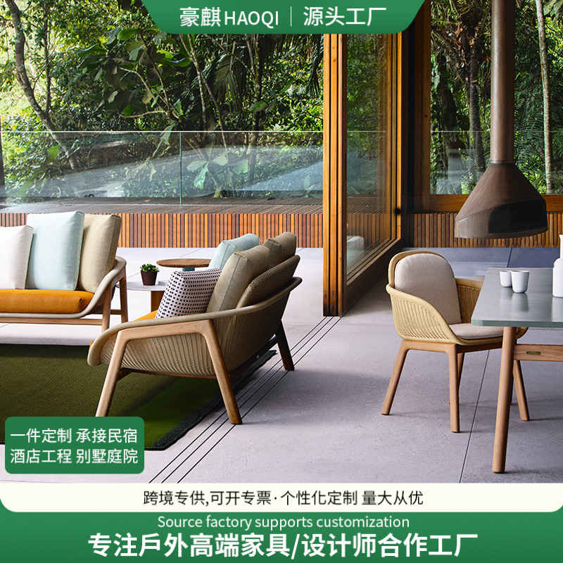 北欧屋外実木ソファーホテル庭園バルコニー防腐チークベッド民宿客間花園ソファーセット