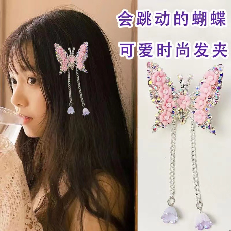 動く蝶のヘアピンの甘い少女風の縁にカモの口を挟んで髪飾りをします。