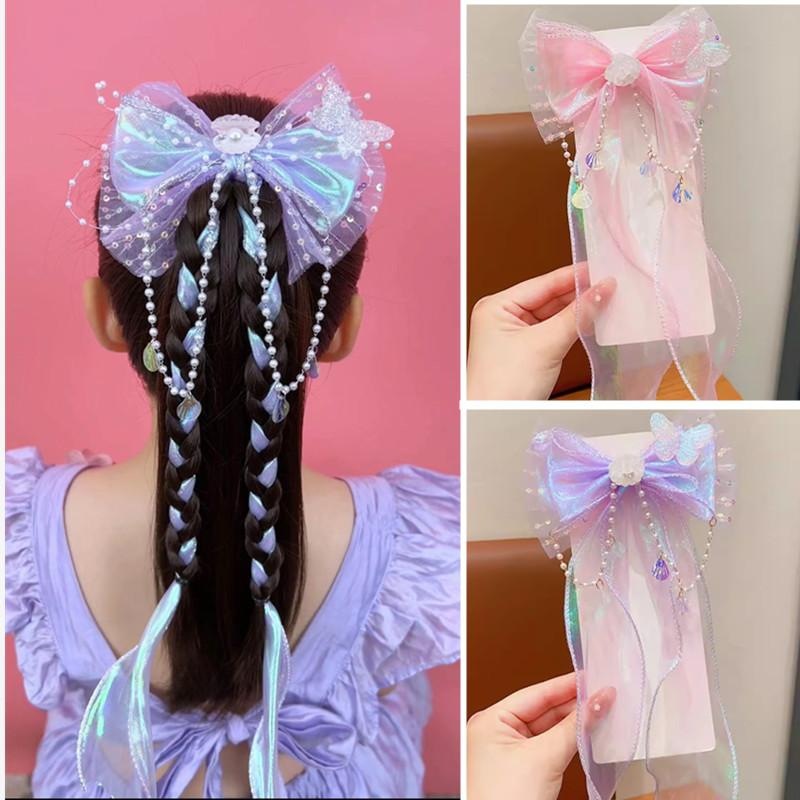 超仙の甘い髪飾りの女の子の蝶結びの長いリボンの人魚のヘアピンは髪を編んで飾ります。