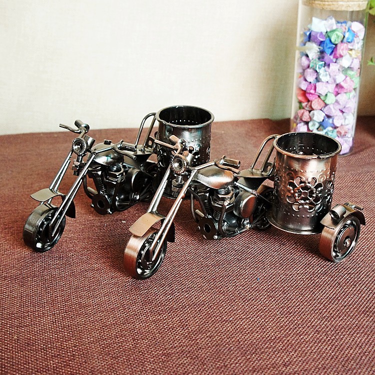 鉄芸の復古は古い三輪のオートバイの筆立ての模型の家庭の書斎の事務室の装飾品をして子供を送ります。