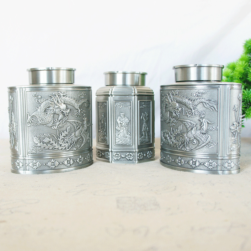 金属製の八仙、八馬、龍と鳳凰の茶缶、古代の錫色の家の装飾収納ボックス、ハイエンド