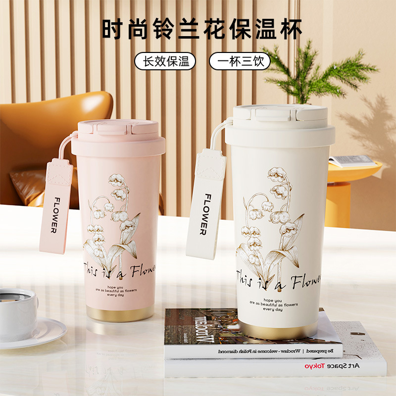 新型保温カップ スズラン柄 コーヒーカップ ティーカップ 携帯用飲料カップ 大容量 女性用 ダブルドリンク ポータブル ギフト