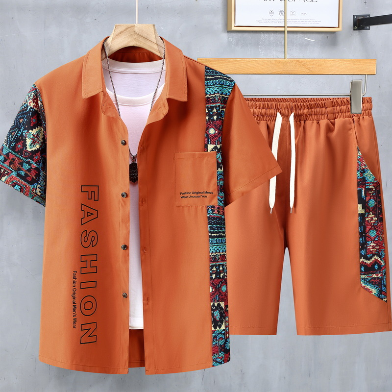 大きいサイズの半袖のシャツのスーツの男性の夏の潮流の民族の風のデブのカジュアルな半ズボンのシャツのゆったりしている2つのセットの男性