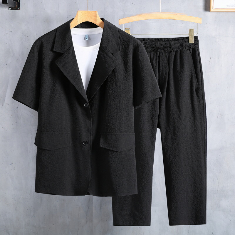 太って大きいサイズの2セットの夏の男性のカジュアルな9分のズボンのスーツのスーツの男性の潮流のデブの半袖のスーツ