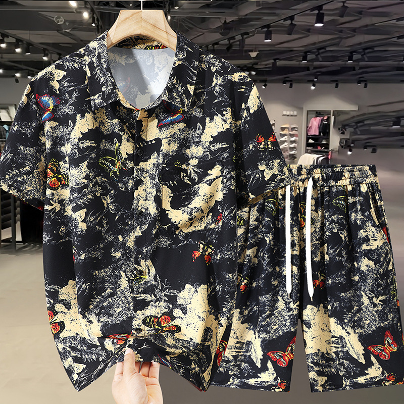 プラスサイズのメンズ半袖シャツスーツトレンディなルーズストレッチシャツカジュアルパンツファットマンツーピーススーツ