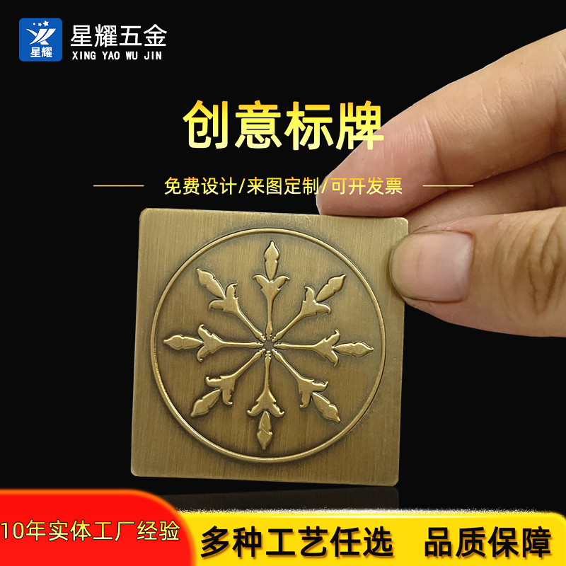 金属バッジ 鉄製プレス加工 古銅風 雪花型看板 木箱ロゴ 電気メッキ アンティーク風銘板製作 胸章