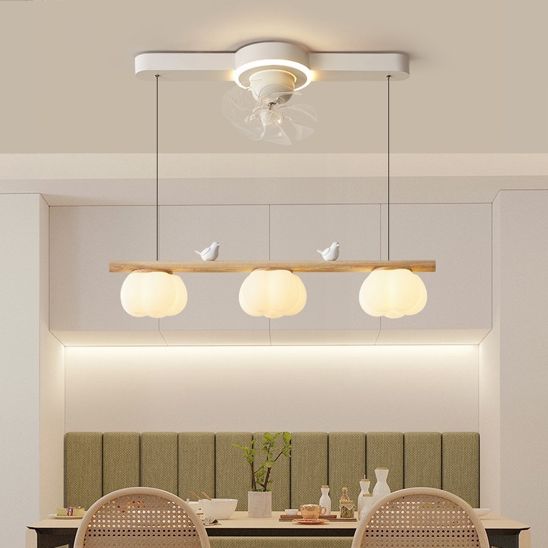 2024年新型レストランファンシャンデリア首振りファンランプシンプル原木クリーム小鳥綿シャンデリア