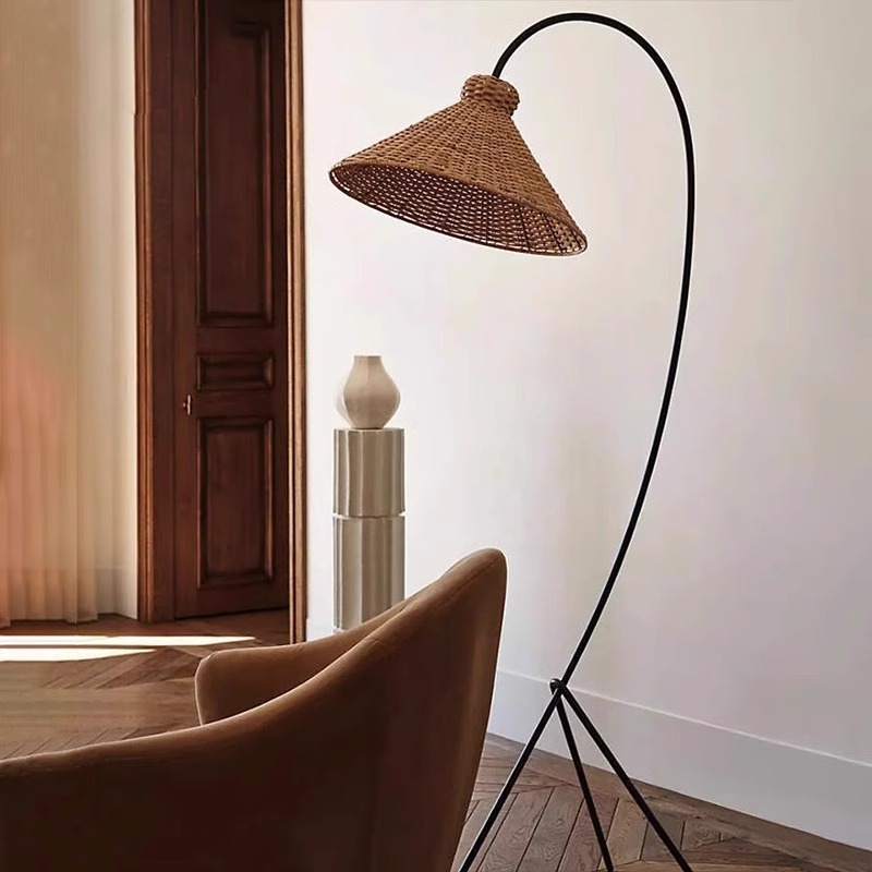 籐編みフロアライトリビングソファ茶卓横縦型スタンドライト中古風高級デザイン感雰囲気釣りライト