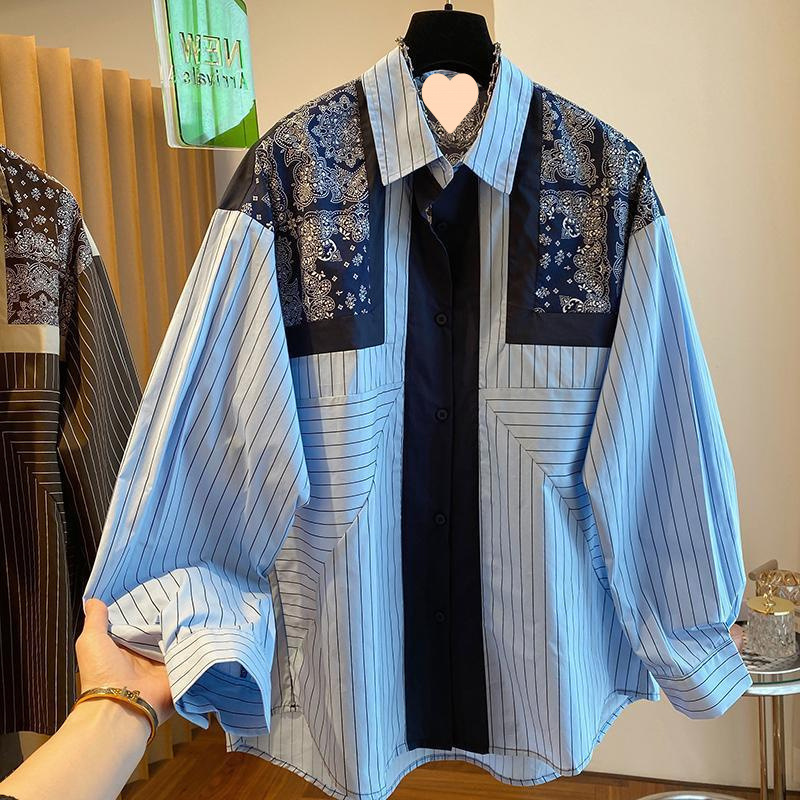 春と秋の大きいサイズのデザイン感のプリントはストライプの長袖のシャツの女性のゆったりした中国風の復古のシャツをつなぎ合わせます。