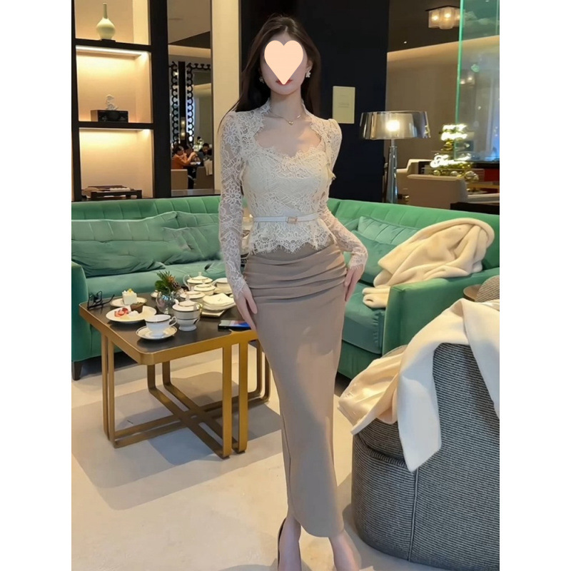 純欲風のスカートの女性の秋の新型レースの上着の気質の高い腰の包みの尻のスカートの2つのセット