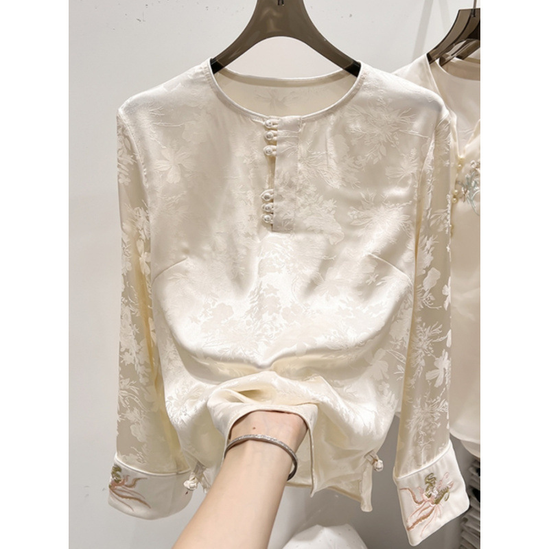 新しい中国風のラウンドネックのサテンの上着のシャツの女性の春のジャカードの刺繍は色にぶつかってシャツをつなぎ合わせます。