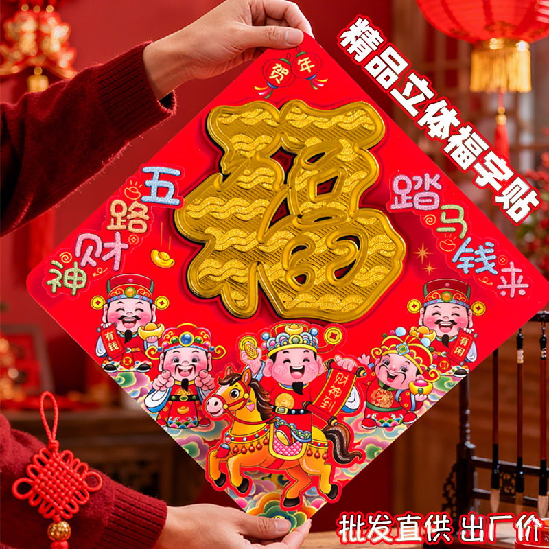 2026年馬年立体福字自己粘着式干支植毛背貼り装飾春節新年飾り福字ドアステッカー