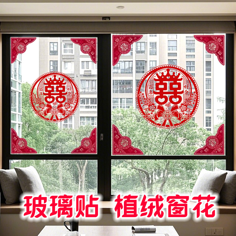 結婚式の植毛窓飾り、ガラスドアステッカー、喜字、コーナーデコレーション、窓ステッカー、結婚式の部屋の装飾、斜めステッカー、結婚式の部屋の装飾