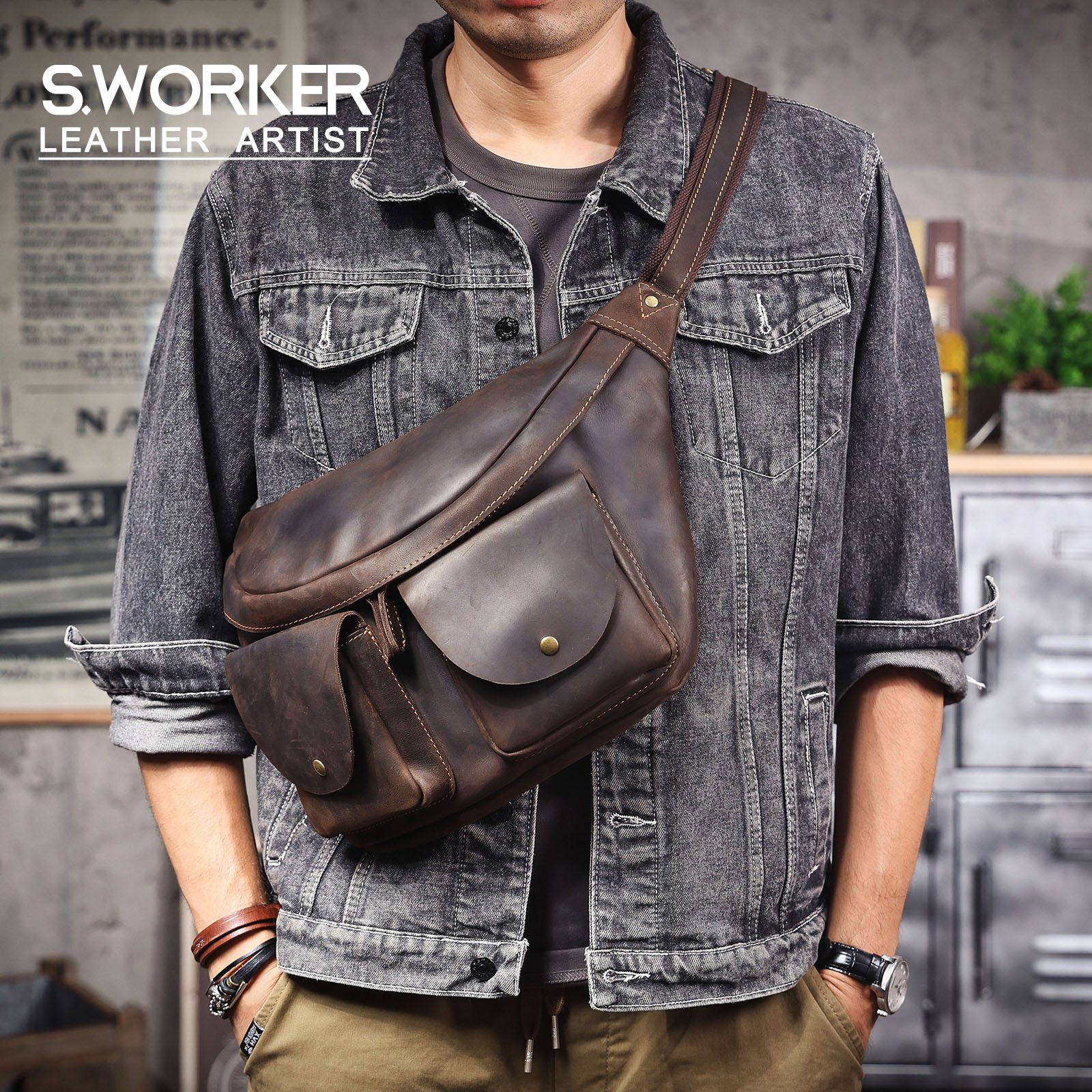 レトロなトップ層牛革レトロな胸バッグ男性シングル肩斜めショルダー機関車バッグ手作りカジュアル真皮対外貿易クロスボーダー