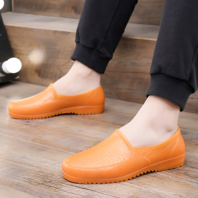 男性の黄色の包頭労働保護靴の平底滑り止め耐摩耗性の柔らかい底のプラスチックの低い台所の仕事の靴の水晶のゴムの靴を手伝います。