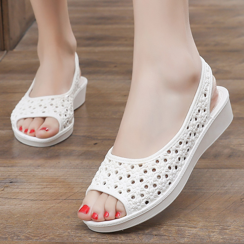 平と柔らかい底の女性のサンダルは夏にファッション的な透かし彫りの通気性の魚の口の靴を履いて中年のお母さんのサンダルを漕いでいます。