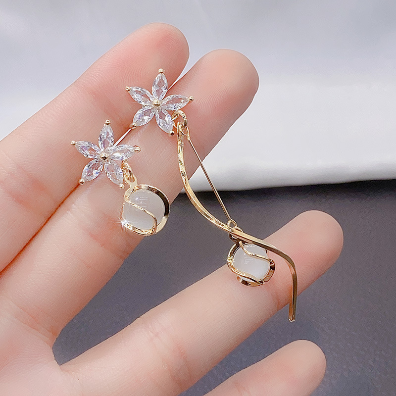 非対称ab型ジルコニウム五弁花イヤリングS925純銀針ピアス猫眼石ペンダントイヤリングシンプル