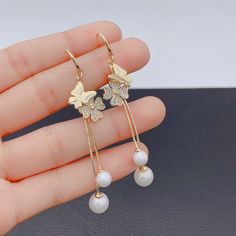 ジルコニウムの蝶の真珠の長いタイプのフリンジのイヤリングの優雅な超仙のイヤリングの女性の大衆の高級感の気質の耳飾り