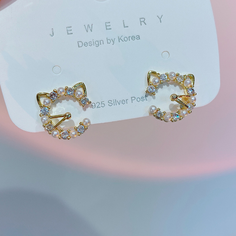 かわいい猫のイヤリングS925純銀耳針猫頭耳釘真珠耳飾り小衆個性気質百合耳クリップ