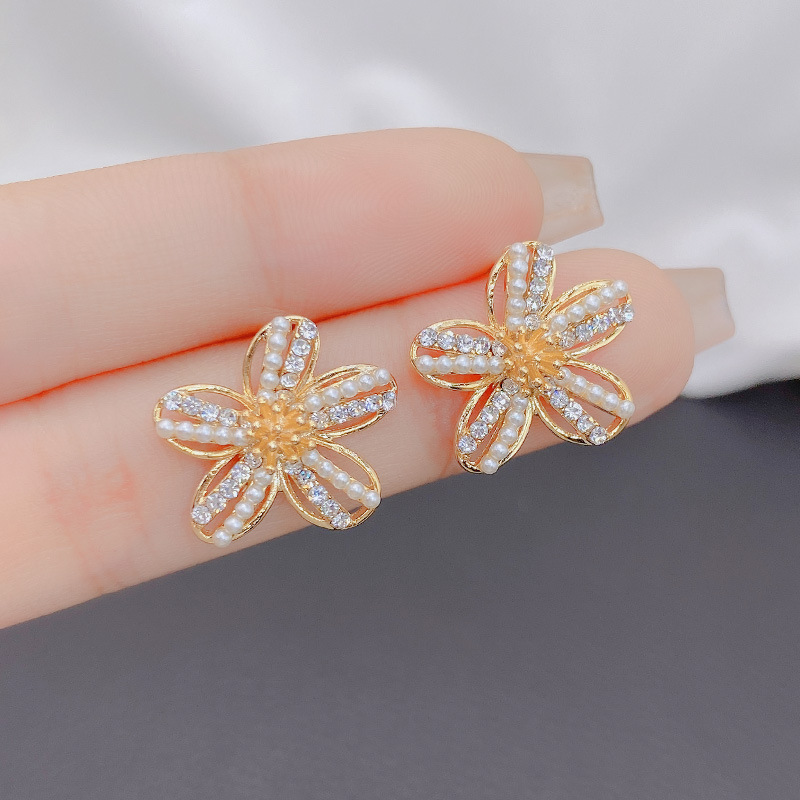 真珠五弁花ピアス女性大衆気質イヤリングファッション個性S925純銀針小清新シンプル耳飾り
