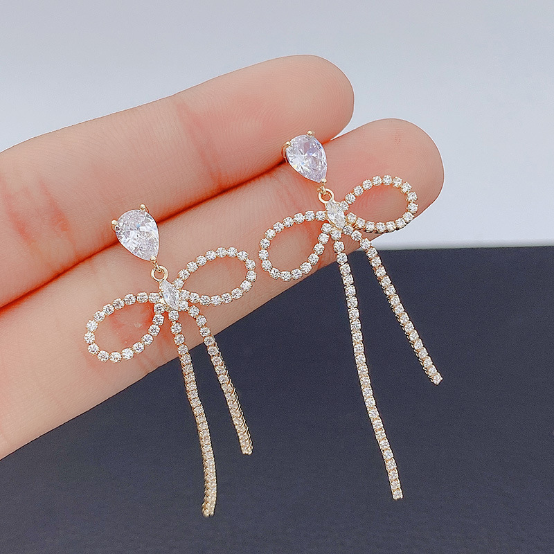 ジルコンの蝶結びのイヤリングの長いタイプはやせた顔の耳飾りが洗練されています。