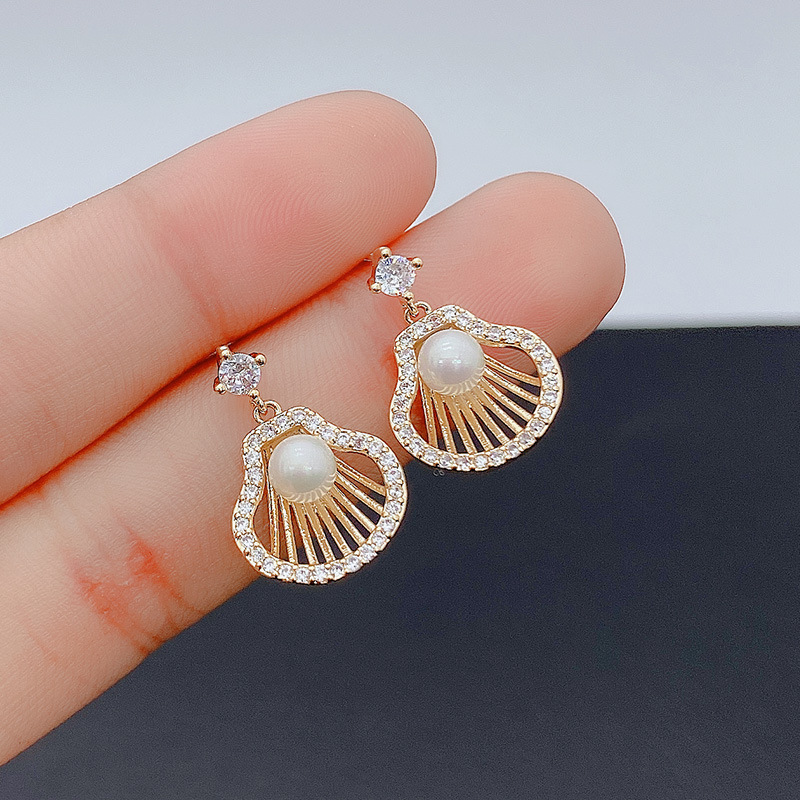 ドリルの貝殻真珠のイヤリングを少しはめ込んでいます。
