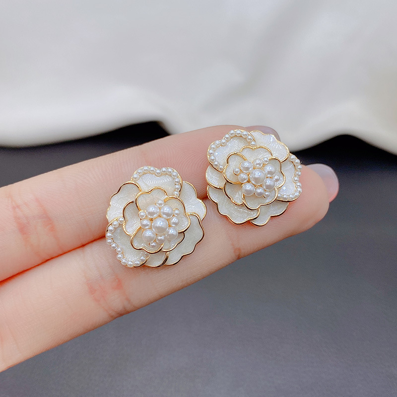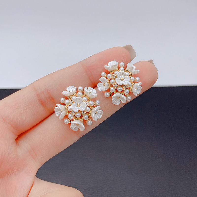 シンプルなフランスの花真珠ピアス女性S925純銀針イヤリングファッション優雅気質耳飾り