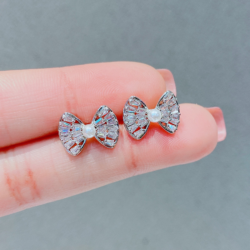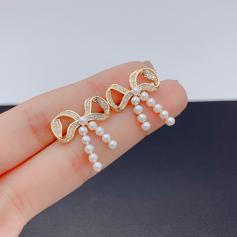 韓国版の真珠の蝶結びのピアスの女性s 925純銀の針のイヤリングは少しいっぱいになっています。