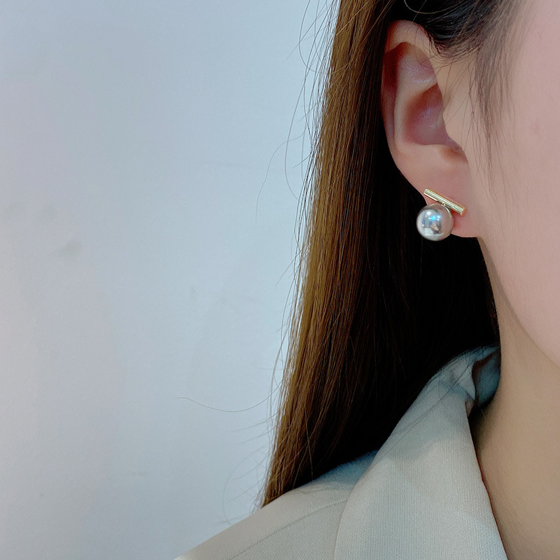 バランスウッドt字パールピアス女性大衆デザイン感個性シンプルイヤリング高級銃グレー気質耳飾り