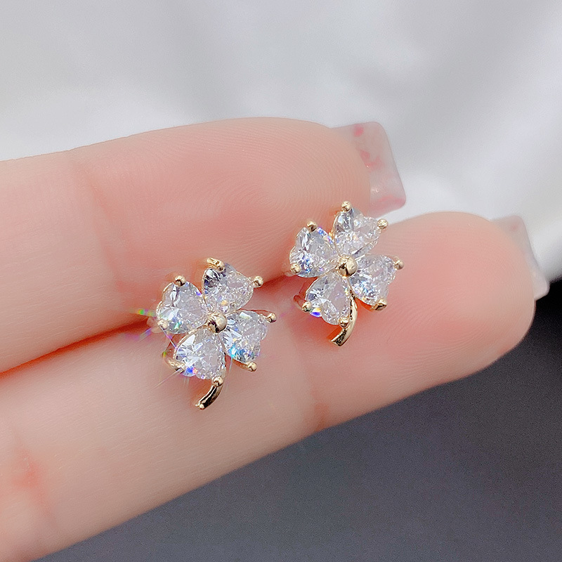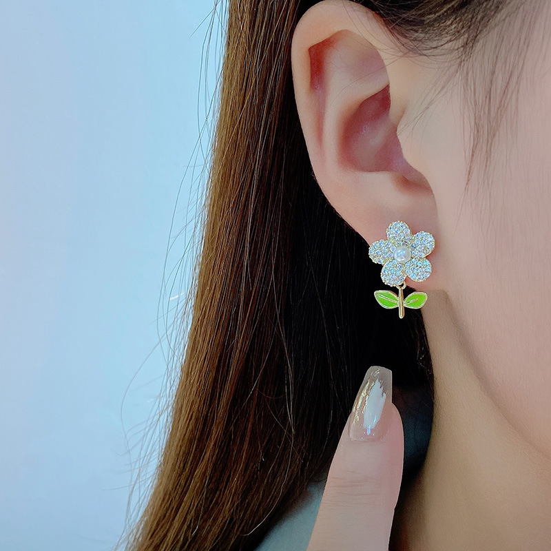 ダイヤモンドいっぱいの純銀の針の花のピアスをちりばめて、小さくて清新で、精巧な耳飾りの緑の花のロマンチックな真珠のイヤリングの女性です。