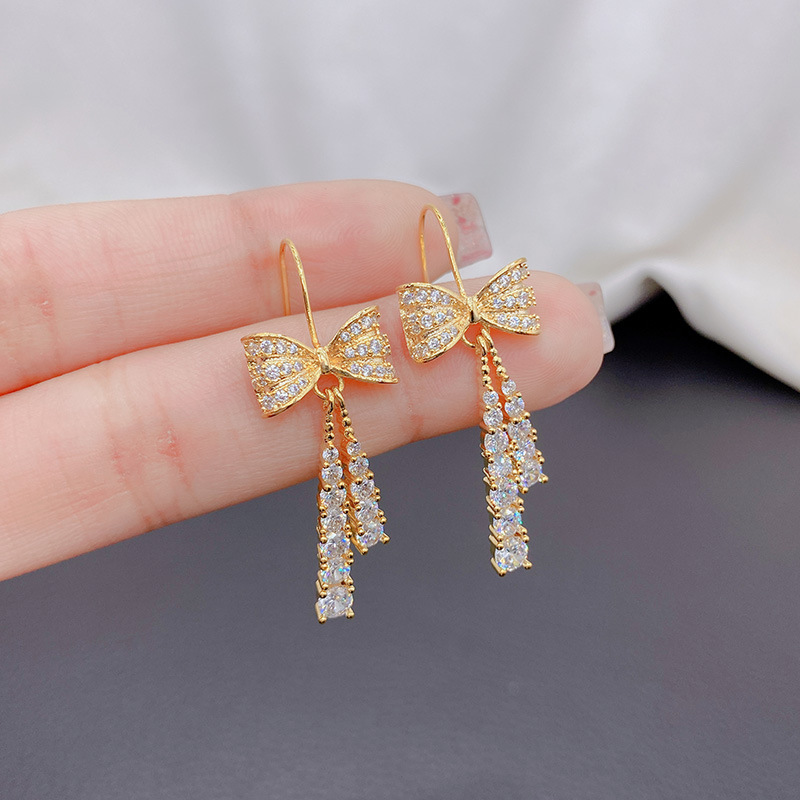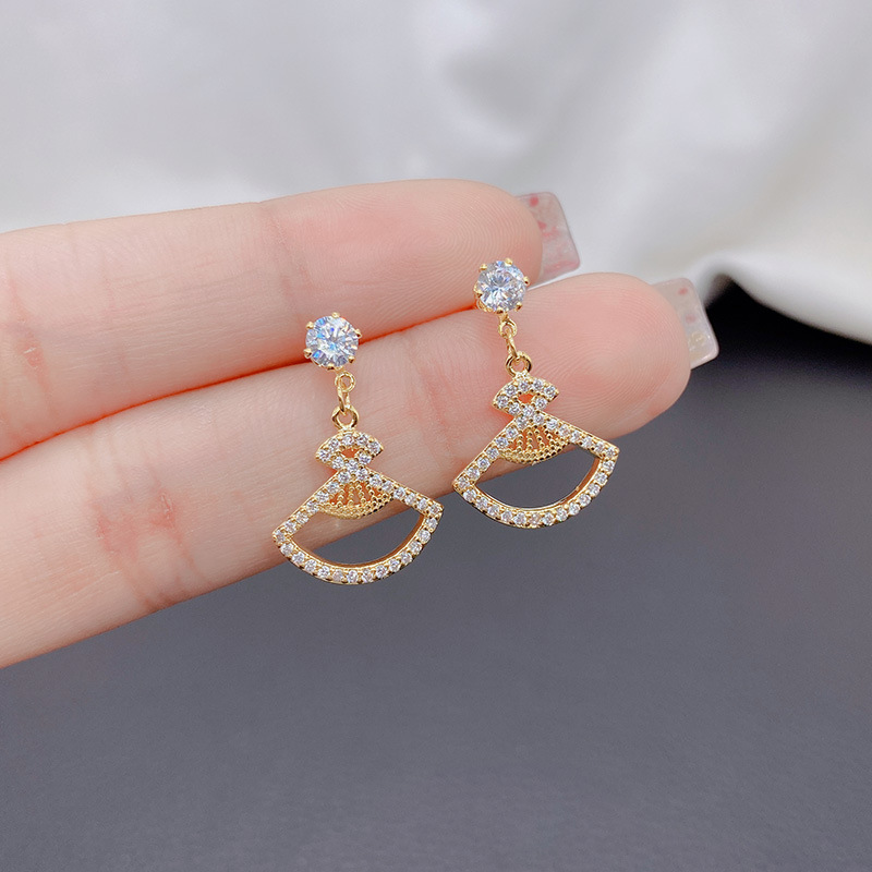 ダイヤモンドをちりばめたジルコンのイヤリングが精巧で優雅で、目を凝らしています。