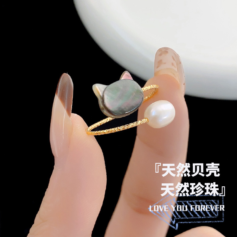 かわいい超仙天然貝殻黒猫指輪女性シンプルで洗練されたラインオープンリング天然真珠の指リング