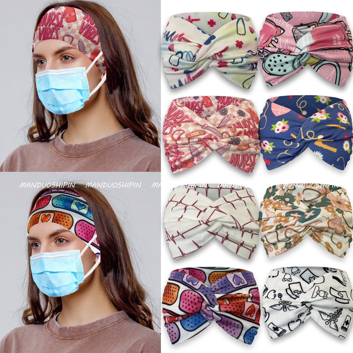 国境を越えて人気のある医療プリントのヘアバンドが交差しているボタンのヘアバンドを防ぐマスクの頭巾医師看護師のヘッドバンド