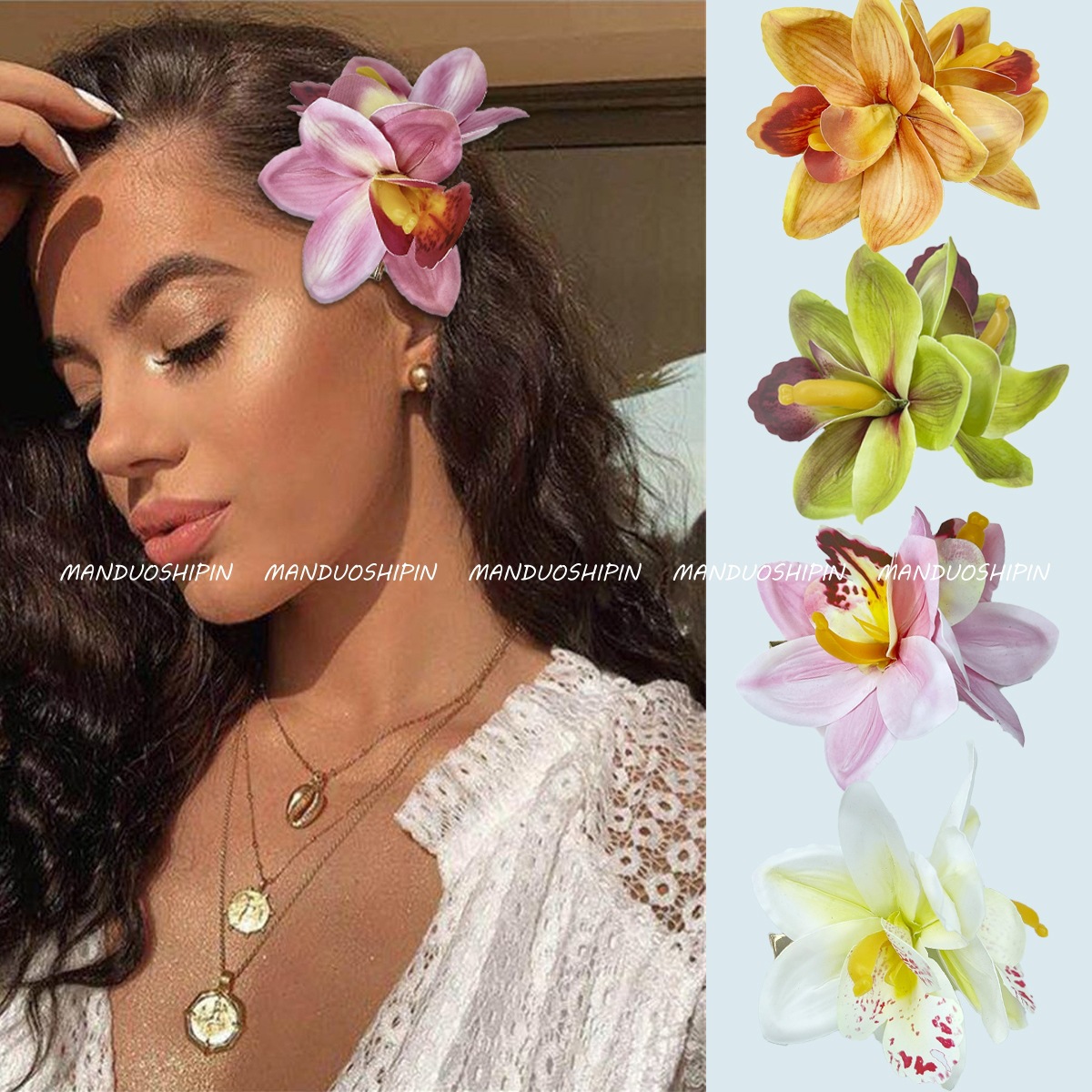 アマゾンの人気のある2つの象牙の蘭の髪はビーチを挟んで写真を撮ります。
