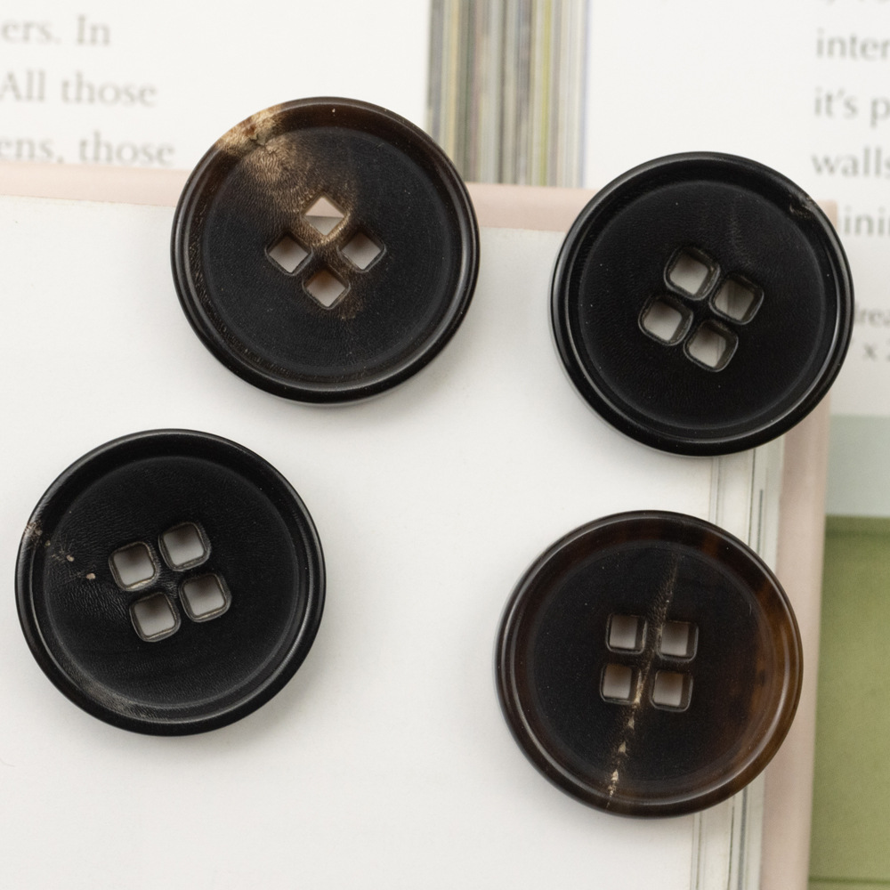 四角い穴の黒いスーツのセーターのカーディガンの牛角ボタンのコーヒー色のコートの天然素材のボタン