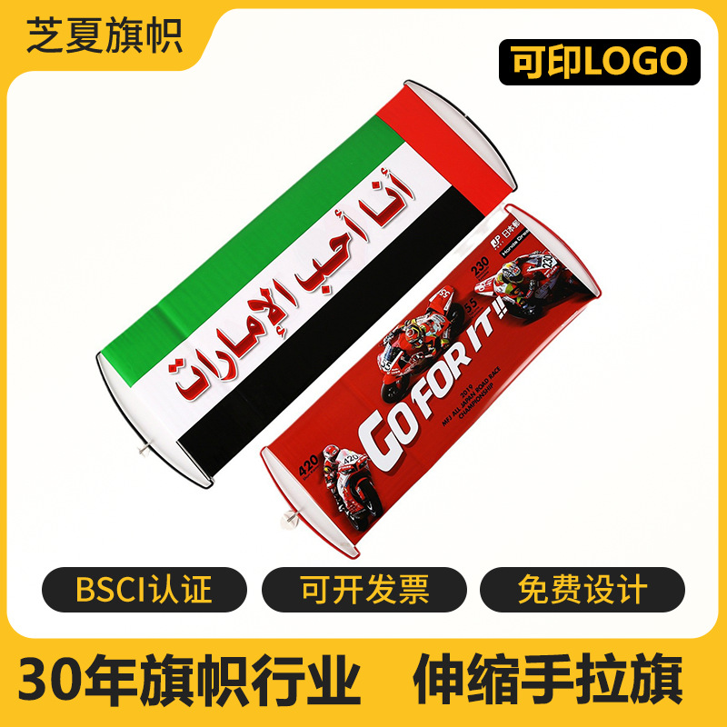 創意自動伸縮手引き旗のスポーツ試合の手引き横断幕の広告は旗を引いて注文して卸売りします。