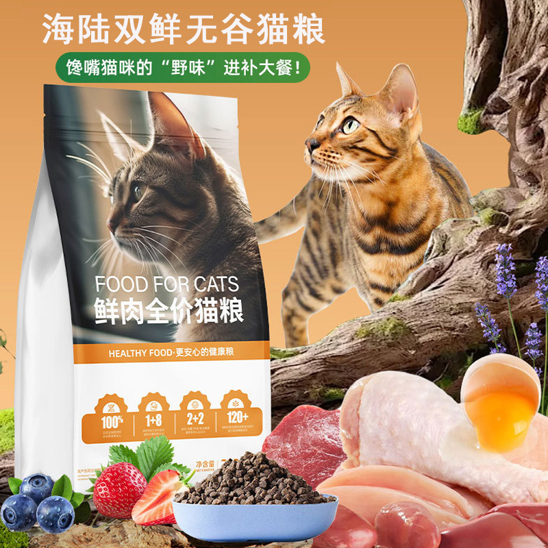 定価、穀物不使用、生肉、魚、子猫、成猫用キャットフード、低アレルギー性、高タンパク質、肥育、毛と顎の美しさ、猫の主食