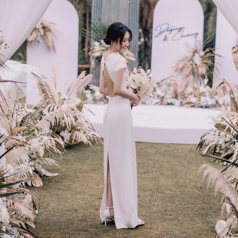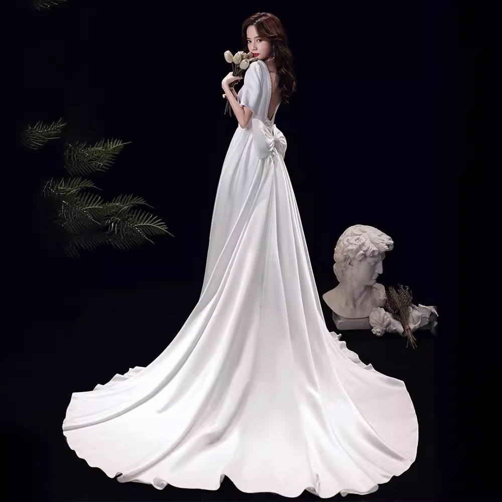 シンプルなサテンの軽いウェディングドレス森系花嫁の超仙旅は、普段は小さなドレスの白い敬酒服を着ることができる