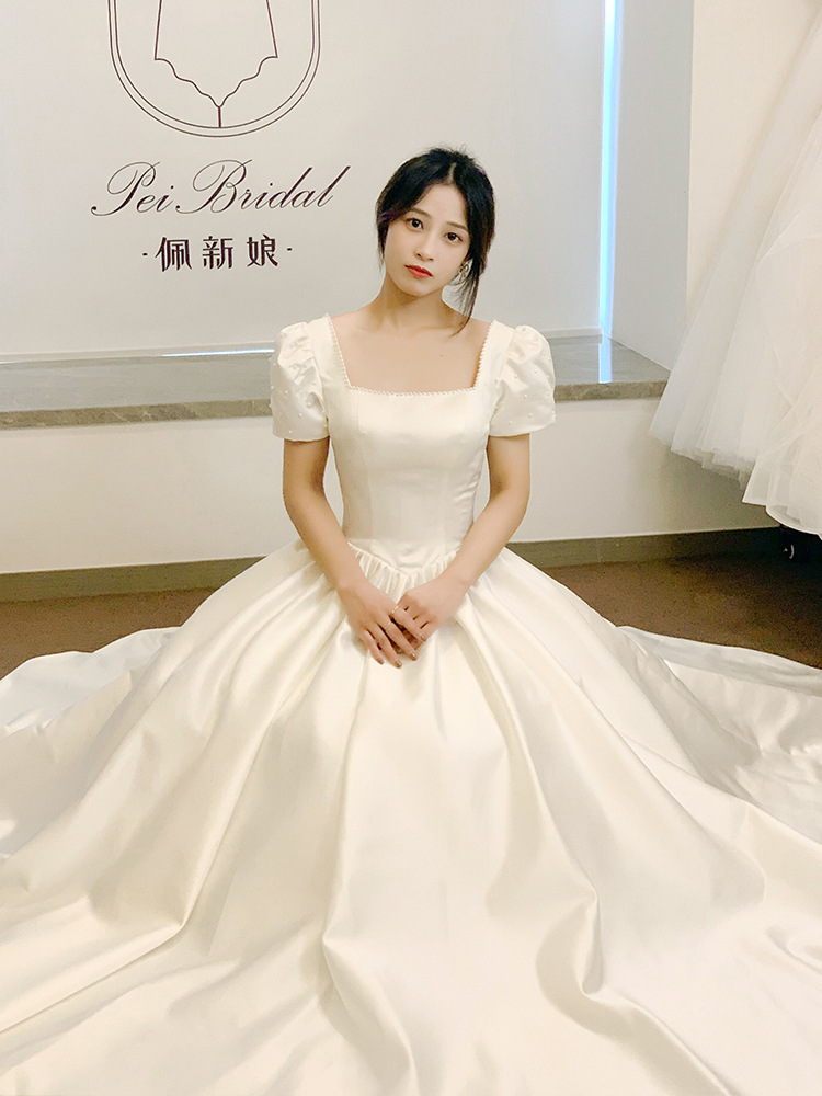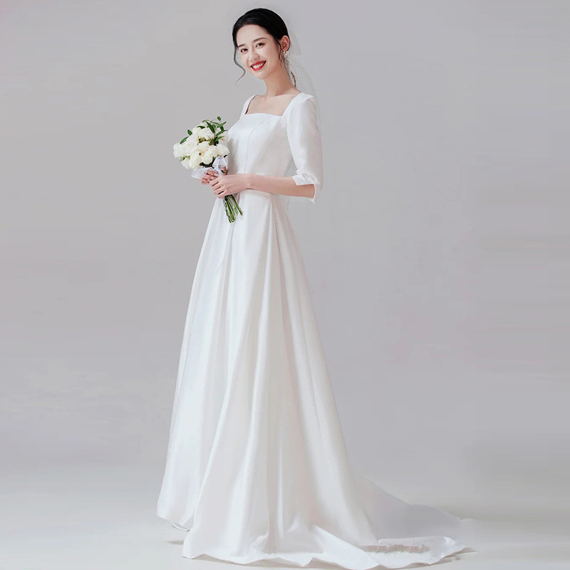 サテンのウェディングドレス2021秋冬新作シンプルでレトロな雰囲気のプリンセス大きい尾小さい子花嫁结婚式ウェディングドレス