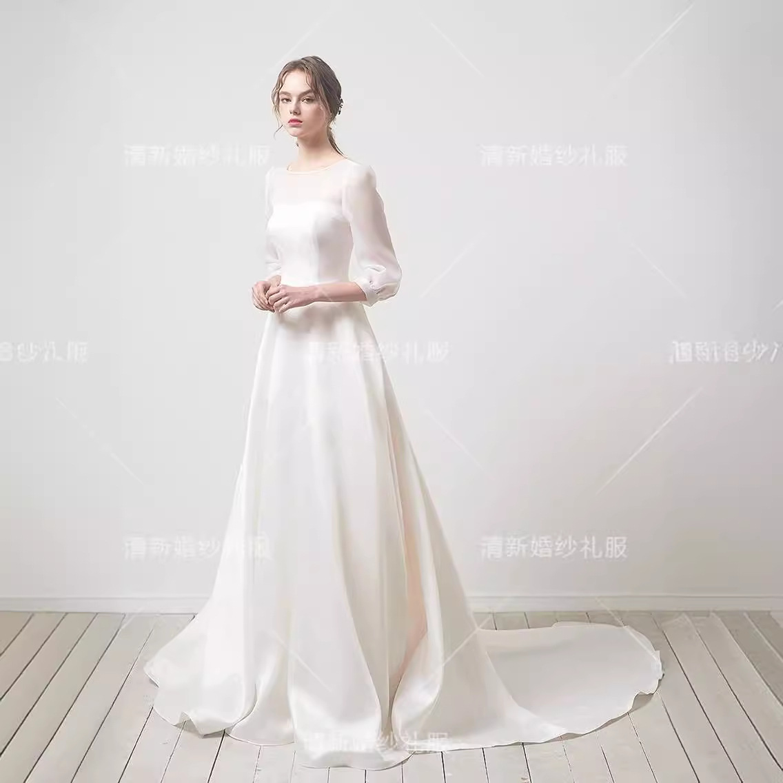 フレンチサテンの軽いウェディングドレスのシンプルな森系長袖の超仙旅は花嫁の結婚の白いドレスを撮ります。
