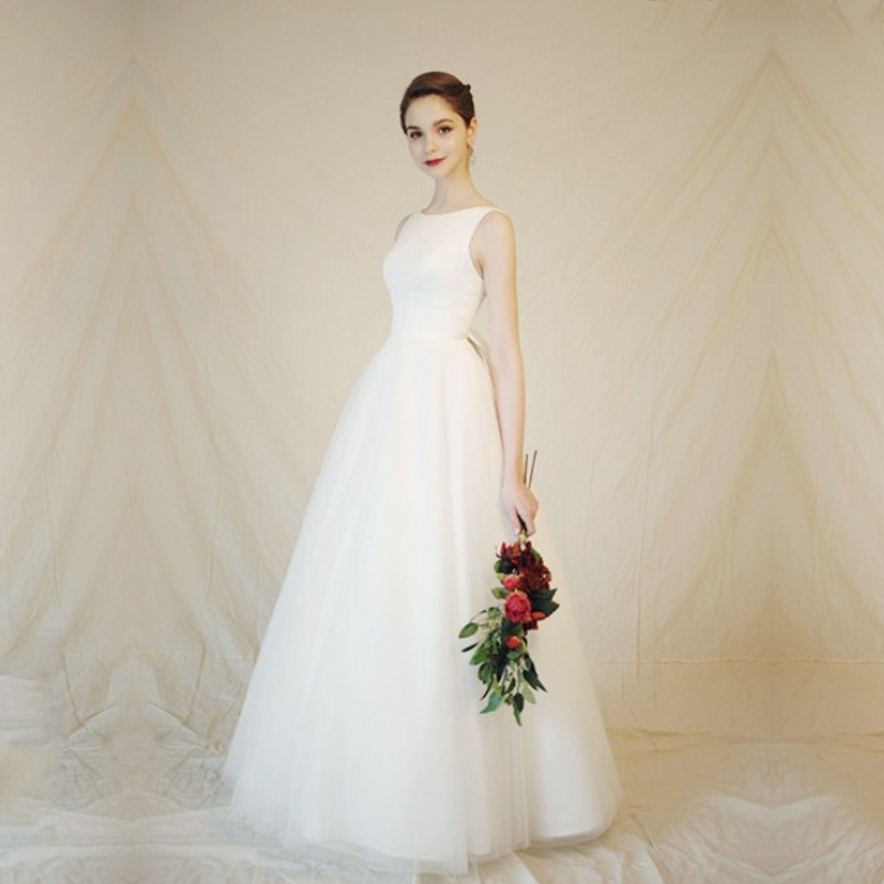 軽いウェディングドレスのフレンチサテンはシンプルで、秋冬の白い色が見えます。