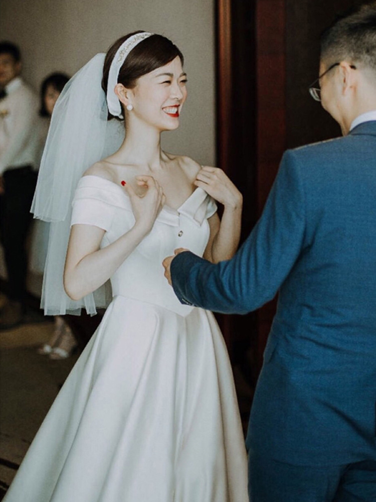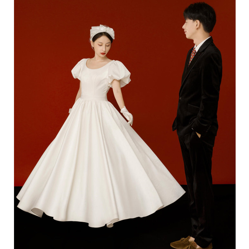 フランスの軽いウェディングドレスのサテンはシンプルでレトロな2021の新しい肩が痩せている花嫁が結婚して旅行に出かけてウェディングドレスを撮る