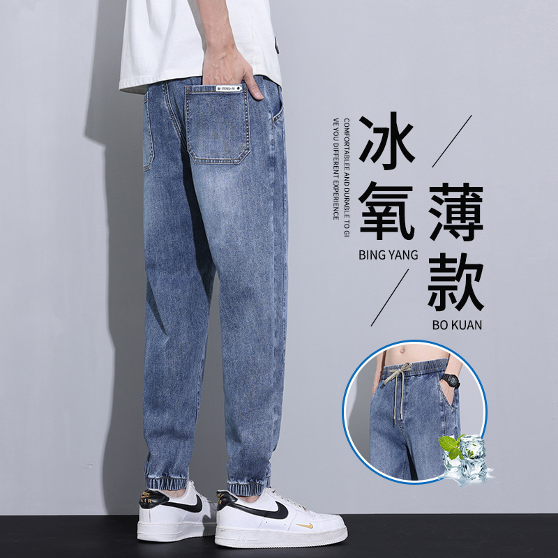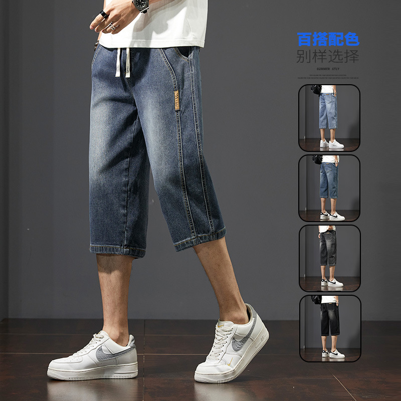 七分デニム半ズボン男性ゆるいストレートひもが膝を越えてズボン2025春の薄いタイプの7分カジュアルズボン