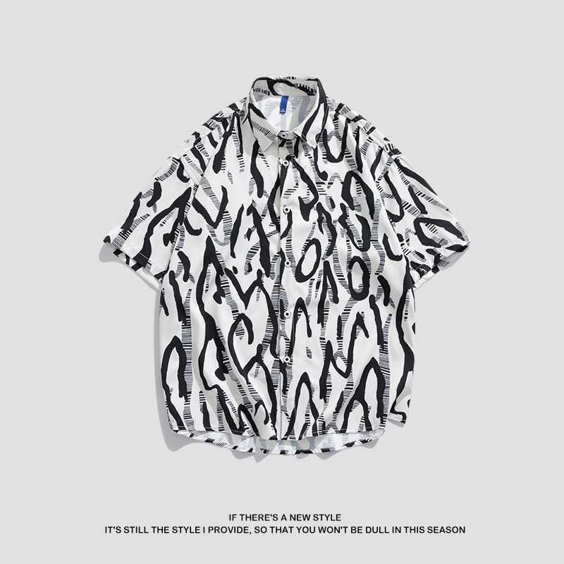 2023年夏の新型香港風シャツ氷糸半袖シャツゆるいオリジナルファッションプリント半袖シャツ男