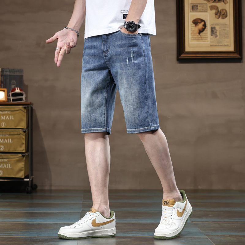 2023夏の薄いファッションのデニムの半ズボンのまっすぐな筒の男性の弾力の百合の青年のカジュアルな5分のズボンのファッションの半ズボン