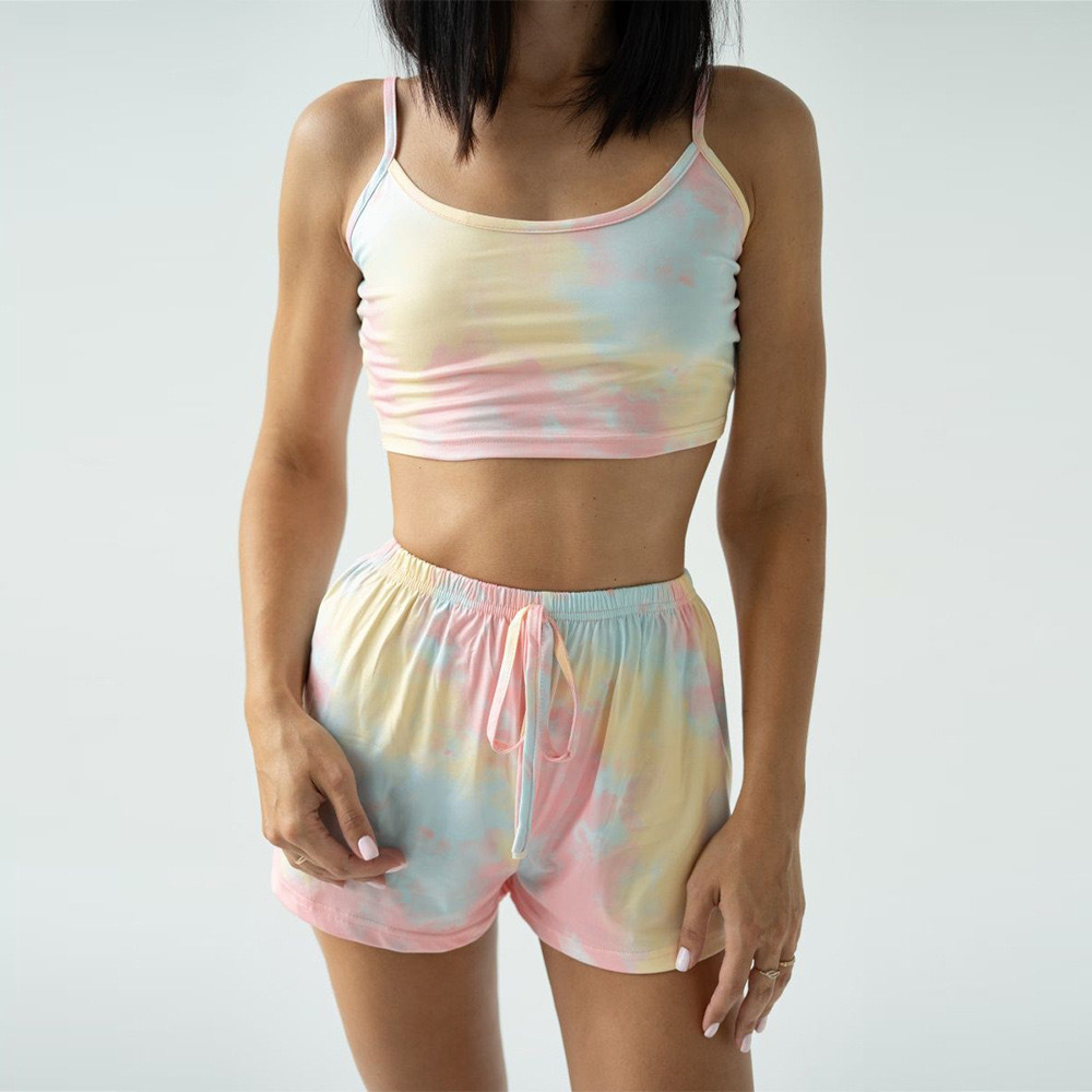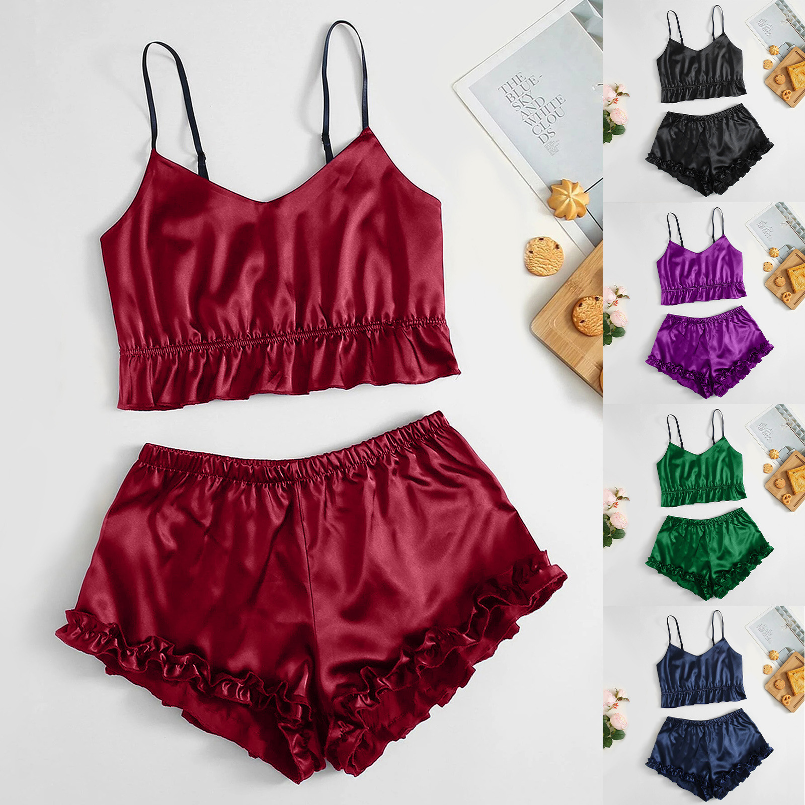 趣味下着欧米の爆発的なセクシーレースのストラップのフリルのショートパンツの女性の居住服の2つのセットの源の卸売り