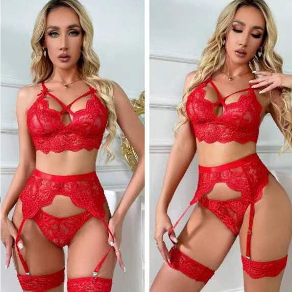 欧米の外国貿易のセクシーな下着のパジャマのレースの透かし彫りのセクシーな魅力のガーターの3点式のセクシーな集まり